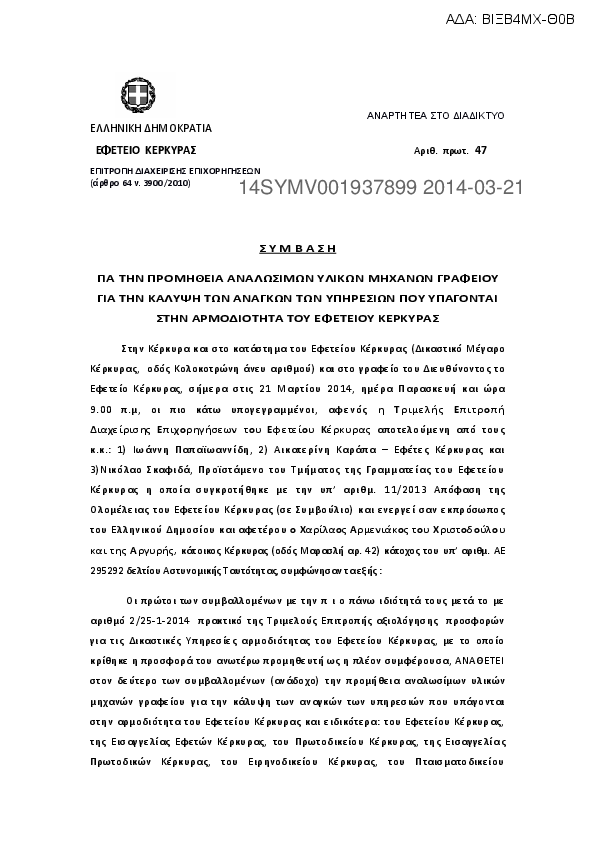 1. Σύμβαση προμήθειας αναλωσίμων υλικών μηχανών γραφείου δικ. υπηρεσιών αρμοδιότητας Εφετείου Κέρκυρας