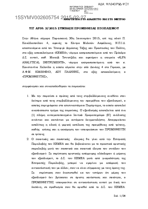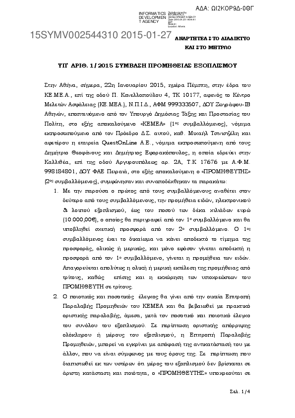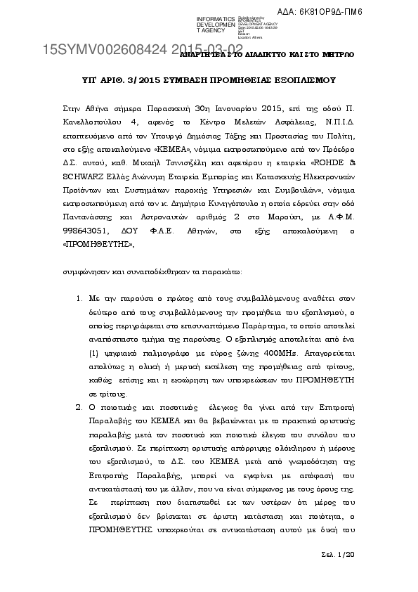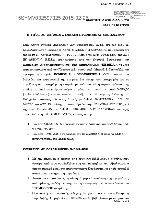 1. ΥΠ’ ΑΡΙΘ. 1/2015 ΣΥΜΒΑΣΗ ΠΡΟΜΗΘΕΙΑΣ ΕΞΟΠΛΙΣΜΟΥ