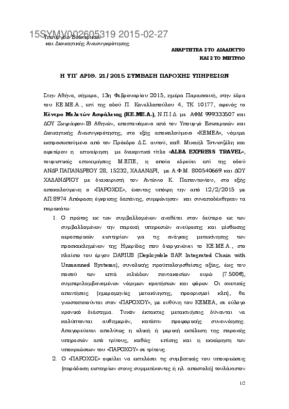 6. ΥΠ’ ΑΡΙΘ. 21/2015 ΣΥΜΒΑΣΗ ΠΑΡΟΧΗΣ ΥΠΗΡΕΣΙΩΝ