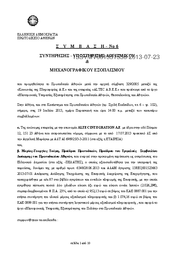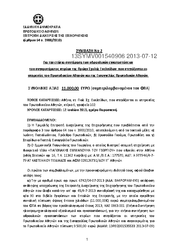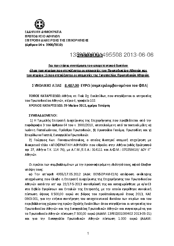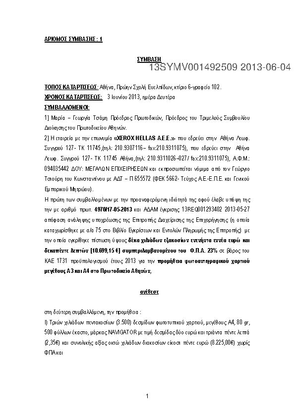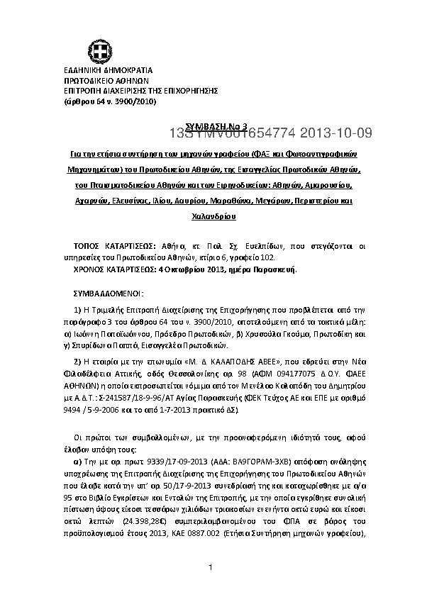 1. Σύμβαση ετήσιας συντήρησης μηχανών γραφείου (φαξ και φωτ. μηχ) του Πρωτ.Αθ, Εισ.Αθ, Πτ.Αθ κ Ειρηνοδ.