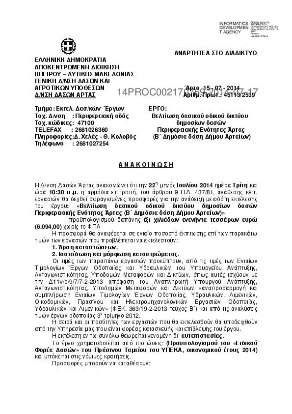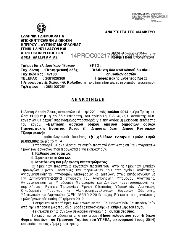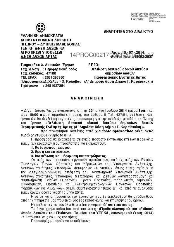 10. ΑΝΑΚΟΙΝΩΣΗ (ΔΙΑΚΗΡΥΞΗ) για το έργο: «Συντήρηση – Βελτίωση δασικού οδικού δικτύου στις Δημοτικές Ενότ