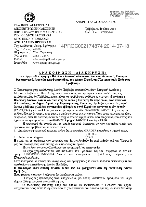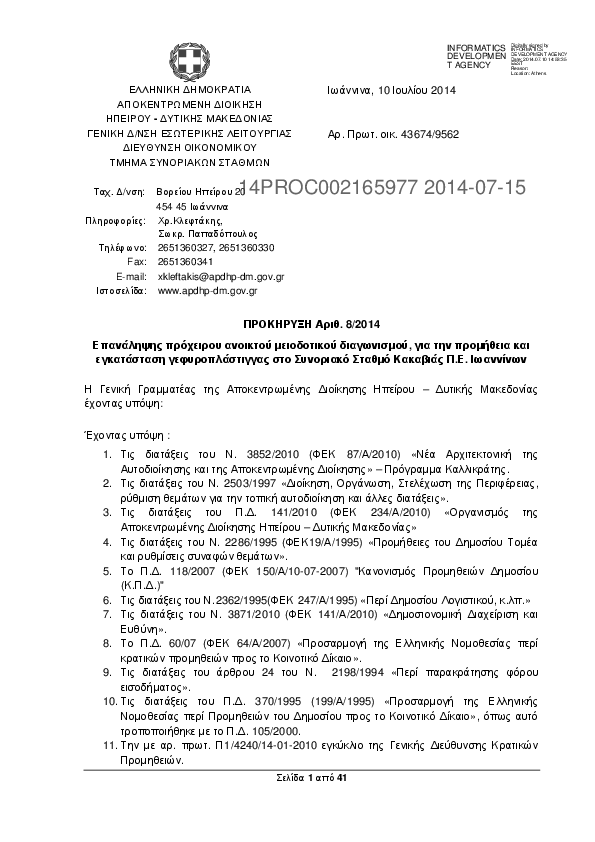 5. ΠΡΠΚΗΡΥΞΗ 8/2014 : Επανάληψης πρόχειρου ανοικτου μειοδοτικού διαγωνισμού,για την προμήθεια και εγκατ