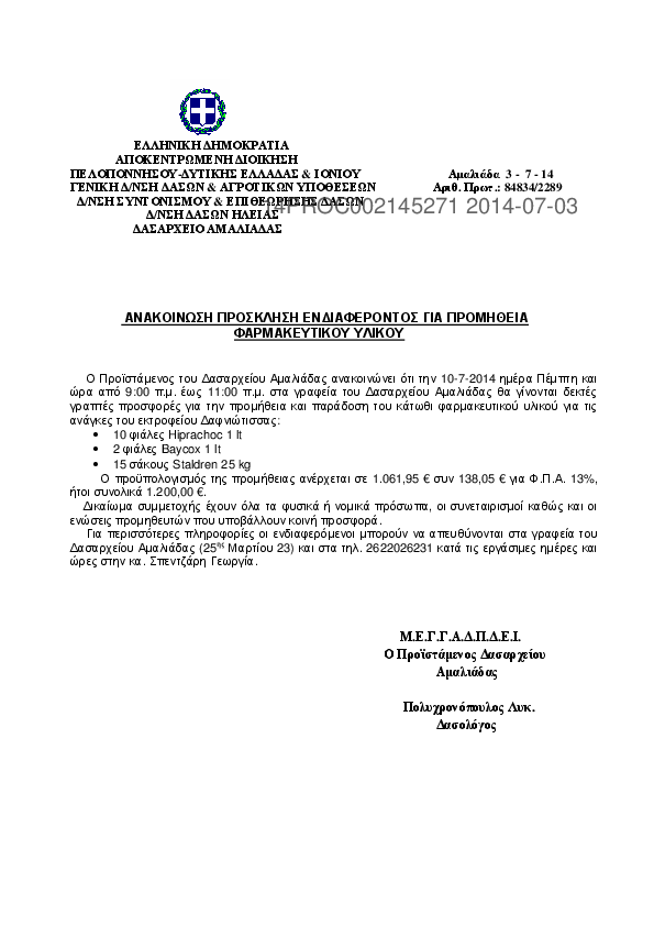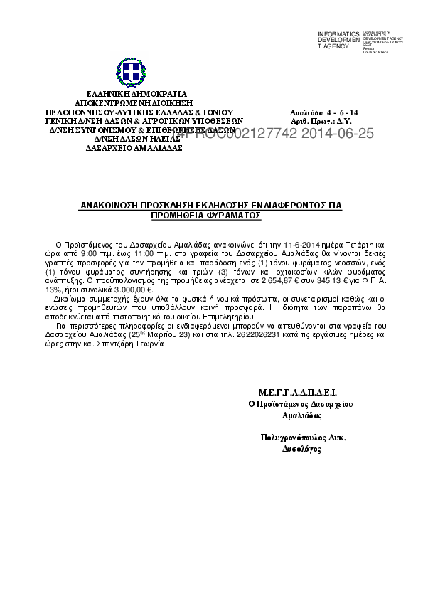 1. Ανακοίνωση, πρόσκληση εκδήλωσης ενδιαφέροντος για την προμήθεια φυράματος