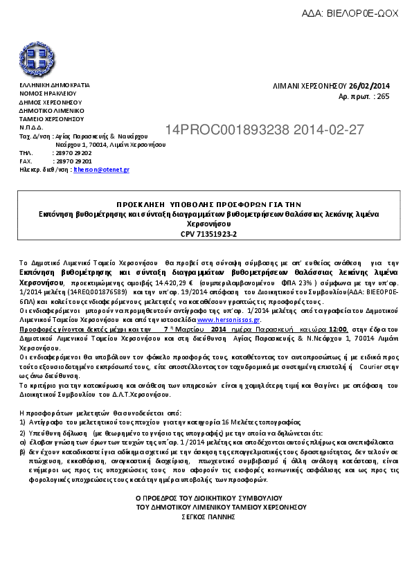 3. ΠΡΟΣΚΛΗΣΗ ΥΠΟΒΟΛΗΣ ΠΡΟΣΦΟΡΩΝ ΓΙΑ ΤΗΝ Εκπόνηση βυθομέτρησης και σύνταξη διαγραμμάτων βυθομετρήσεων θαλάσσιας λεκάνης λιμένα Χερσονήσου