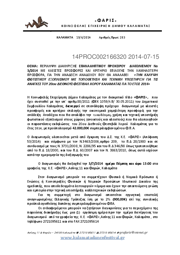 1. ΔΙΑΚΗΡΥΞΗ ΠΡΟΧΕΙΡΟΥ ΔΙΑΓΩΝΙΣΜΟΥ ΓΙΑ ΤΗΝ ΚΑΛΥΨΗ ΦΩΤΙΣΤΙΚΟΥ ΕΞΟΠΛΙΣΜΟΥ 20ου Δ.Φ.Χ. ΚΑΛΑΜΑΤΑΣ