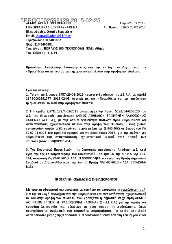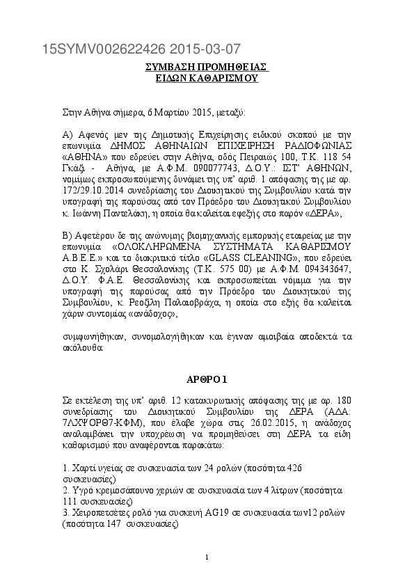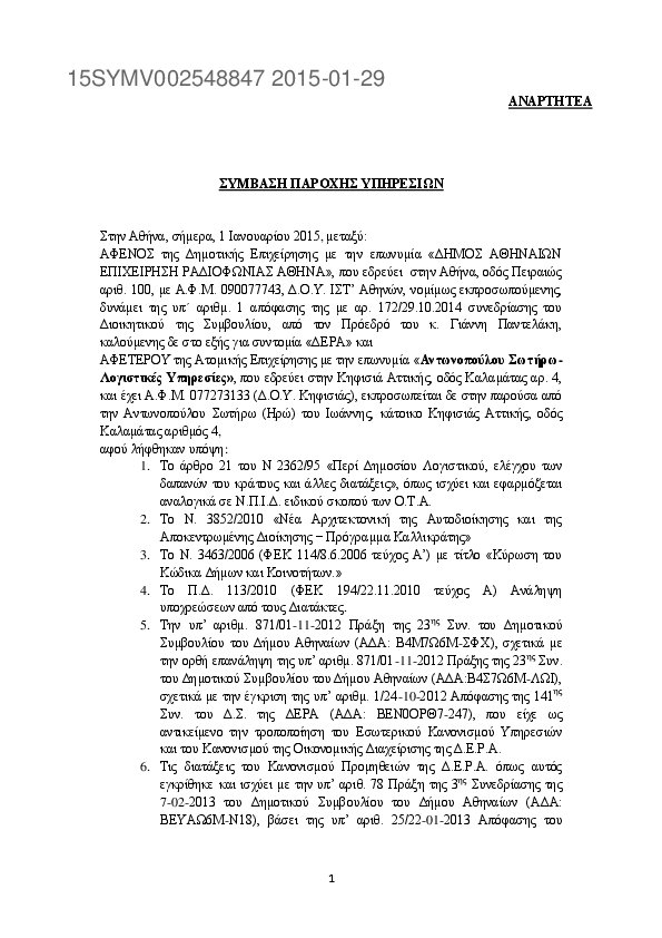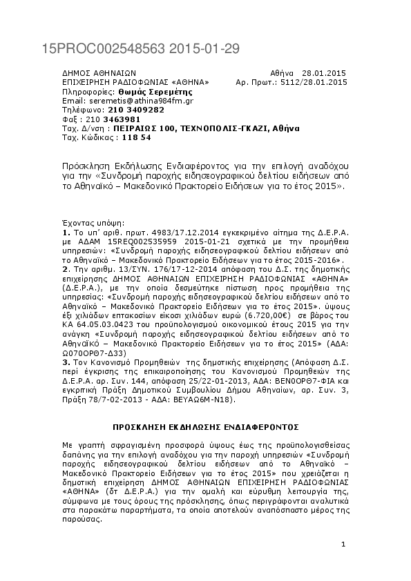 1. Συνδρομή παροχής ειδησεογραφικού δελτίου από το Αθηναϊκό-Μακεδονικό Πρακτορείο ειδήσεων για το 2015