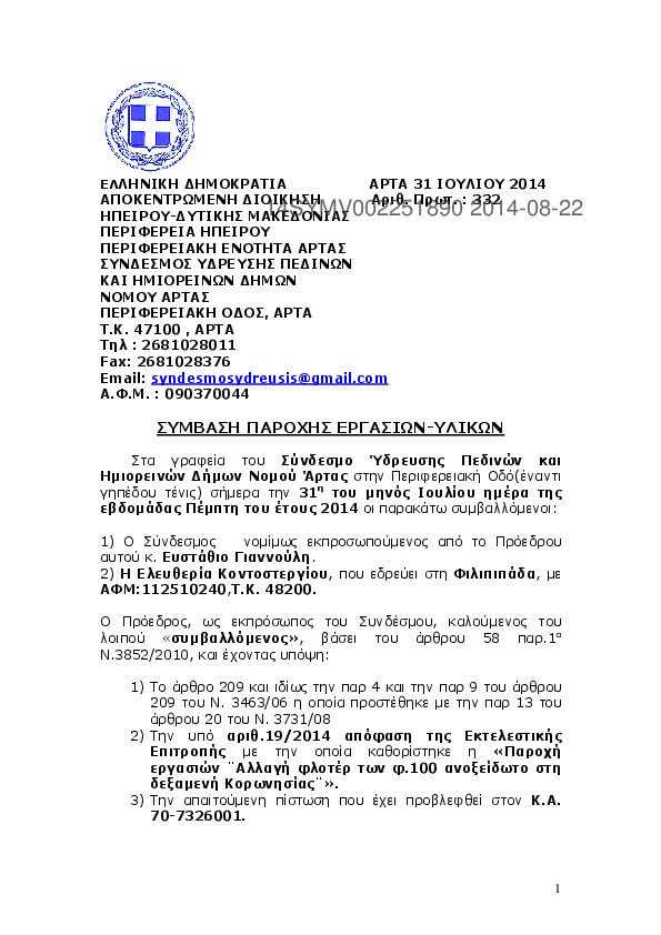 1. ΣΥΜΒΑΣΗ ΠΑΡΟΧΗΣ ΕΡΓΑΣΙΩΝ ¨Τοποθέτηση παροχής στους υδατόπυργους του Συνδέσμου για χλωρίωση νερού