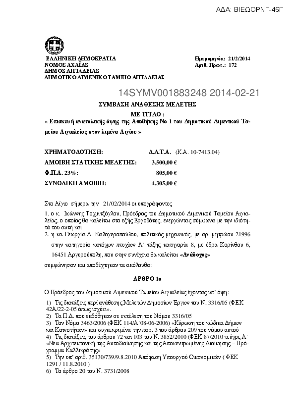 9. ΣΥΜΒΑΣΗ ΑΝΑΘΕΣΗΣ ΜΕΛΕΤΗΣ ΜΕ ΤΙΤΛΟ : « Επισκευή ανατολικής όψης της Αποθήκης Νο 1 του Δημοτικού Λιμεν