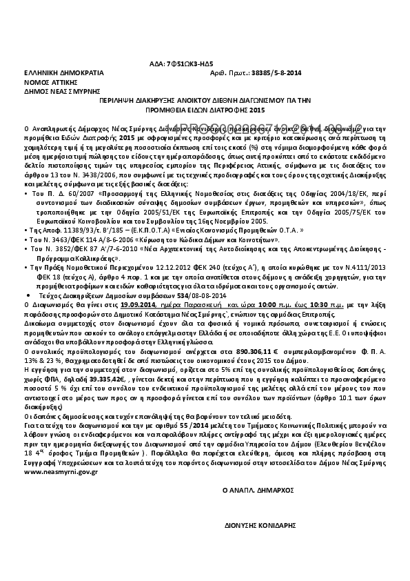 7. ΠΕΡΙΛΗΨΗ ΔΙΑΚΥΡΗΞΗΣ ΑΝΟΙΚΤΟΥ ΔΙΑΓΩΝΙΣΜΟΥ ΓΙΑ ΤΗΝ ΠΡΟΜΗΘΕΙΑ ΕΙΔΩΝ ΔΙΑΤΡΟΦΗΣ 2015
