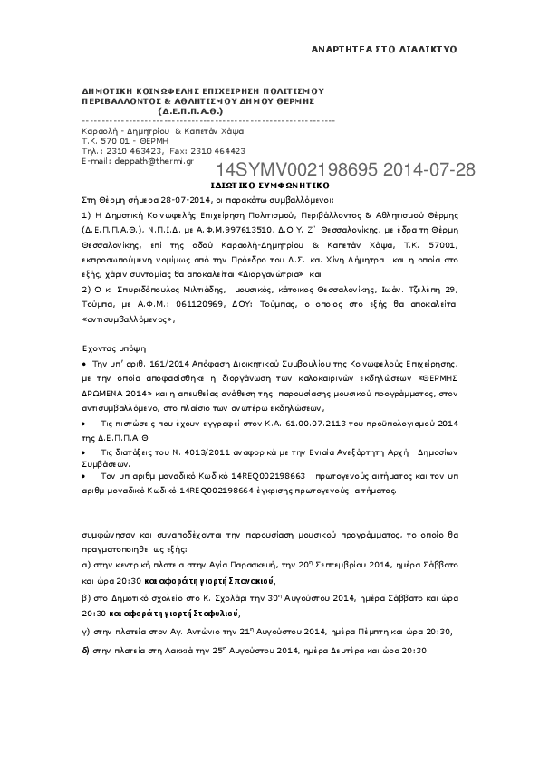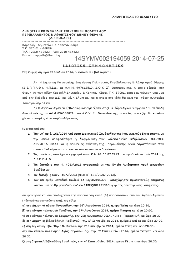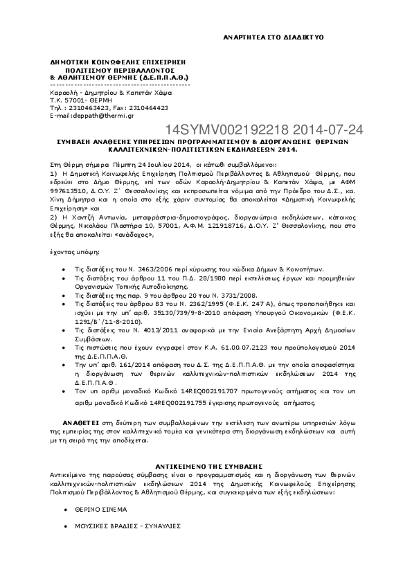 9. ΣΥΜΒΑΣΗ ΑΝΑΘΕΣΗΣ ΥΠΗΡΕΣΙΩΝ ΠΡΟΓΡΑΜΜΑΤΙΣΜΟΥ & ΔΙΟΡΓΑΝΩΣΗΣ ΘΕΡΙΝΩΝ ΠΟΛΙΤΙΣΤΙΚΩΝ ΕΚΔΗΛΩΣΕΩΝ 2014