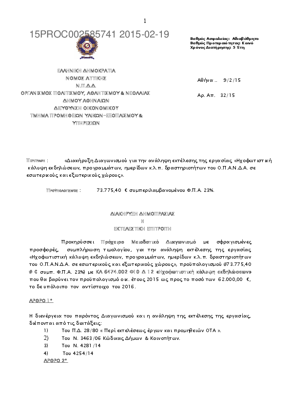 6. ΕΓΚΡΙΣΗ ΠΟΣΟΥ 73.775,40 € ΣΥΜΠ. Φ.Π.Α. 23% ΚΑΙ ΕΓΚΡΙΣΗ ΟΡΩΝ ΤΗΣ ΔΙΑΚΗΡΥΞΗΣ ΓΙΑ ΤΗΝ ΔΙΕΝΕΡΓΕΙΑ ΠΡΟΧΕΙΡΟΥ ΜΕΙΟΔΟΤΙΚΟΥ ΔΙΑΓΩΝΙΣΜΟΥ ΓΙΑ ΤΗΝ ΑΝΑΛΗΨΗ ΕΚΤΕΛΕΣΗΣ ΕΡΓΑΣΙΑΣ “ΗΧΟΦΩΤΙΣΤΙΚΗ ΚΑΛΥΨΗ ΕΚΔΗΛΩΣΕΩΝ,ΠΡΟΓΡΑΜΜΑΤΩΝ, ΗΜΕΡΙΔΩΝ Κ.Λ.Π. ΔΡΑΣΤΗΡΙΟΤΗΤ...