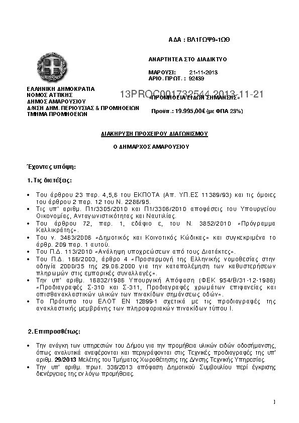 1. ΔΙΑΚΗΡΥΞΗ ΔΗΜΑΡΧΟΥ ΠΡΟΧΕΙΡΟΥ ΔΙΑΓΩΝΙΣΜΟΥ ΠΡΟΜΗΘΕΙΑΣ ΥΛΙΚΩΝ ΑΡΔΕΥΣΗΣ ΓΙΑ ΤΗΝ ΥΠΗΡΕΣΙΑ ΠΡΑΣΙΝΟΥ ΤΟΥ ΔΗΜΟΥ