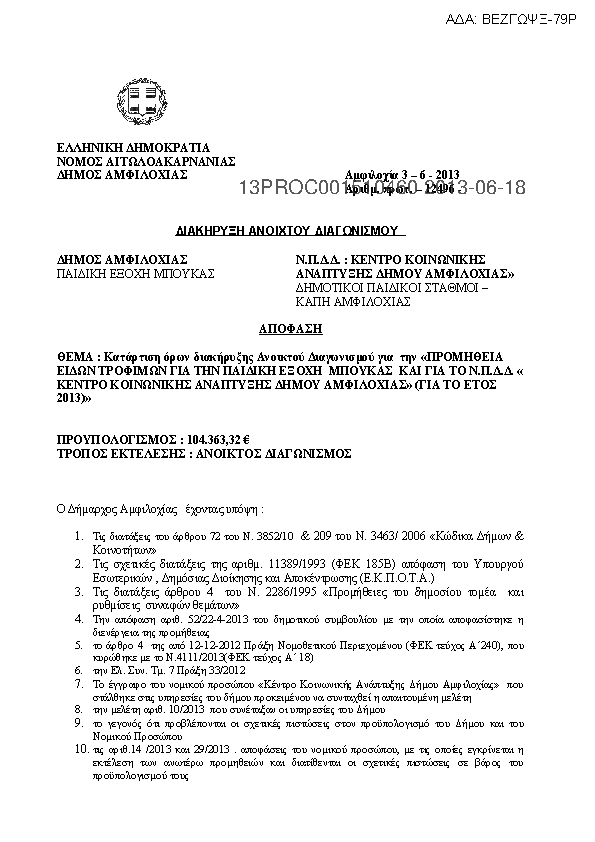 1. ΔΙΑΚΗΡΥΞΗ ΔΙΑΓΩΝΙΣΜΟΥ ΜΕ ΘΕΜΑ : Κατάρτιση όρων διακήρυξης Ανοικτού Διαγωνισμού για την «ΠΡΟΜΗΘΕΙΑ ΕΙΔΩΝ ΤΡΟΦΙΜΩΝ ΓΙΑ ΤΗΝ ΠΑΙΔΙΚΗ ΕΞΟΧΗ ΜΠΟΥΚΑΣ ΚΑΙ ΓΙΑ ΤΟ Ν.Π.Δ.Δ. «ΚΕΝΤΡΟ ΚΟΙΝΩΝΙΚΗΣ ΑΝΑΠΤΥΞΗΣ ΔΗΜΟΥ ΑΜΦΙΛΟΧΙΑΣ» (ΓΙΑ ΤΟ ΕΤΟΣ 2013)