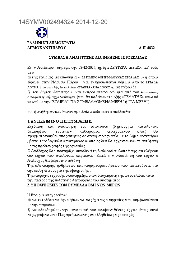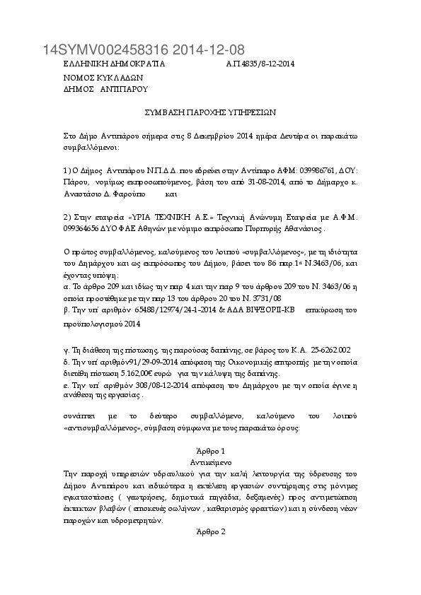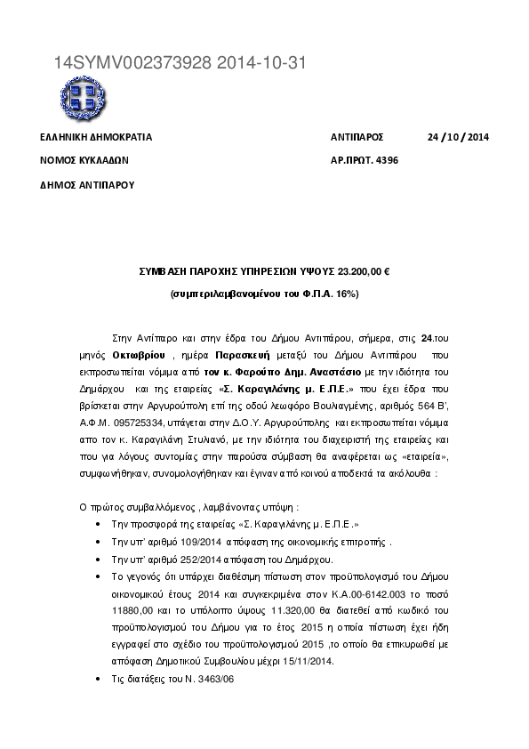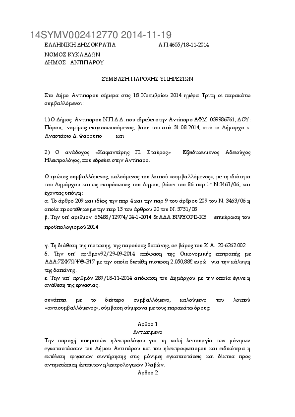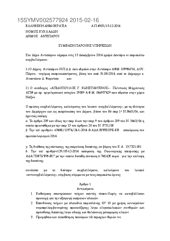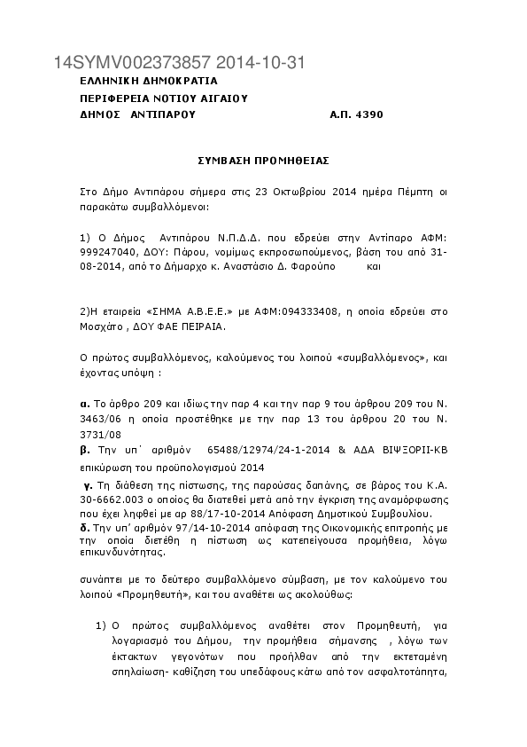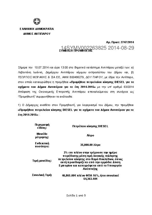 1. Προμήθεια πετρελαίου κίνησης DIESEL για τα οχήματα του Δήμου Αντιπάρου για τα έτη 2014-2015