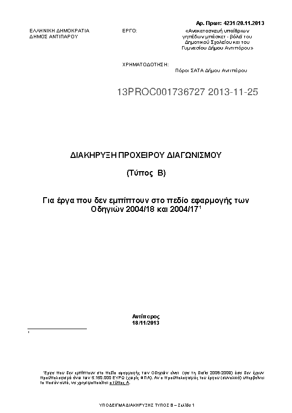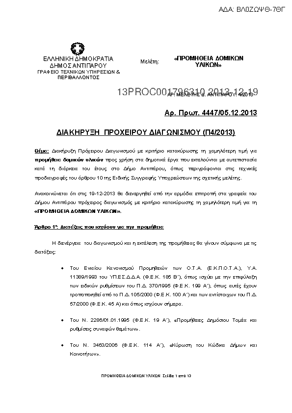 1. ΔΙΑΚΗΡΥΞΗ ΠΡΟΧΕΙΡΟΥ ΔΙΑΓΩΝΙΣΜΟΥ (Π2/2013)