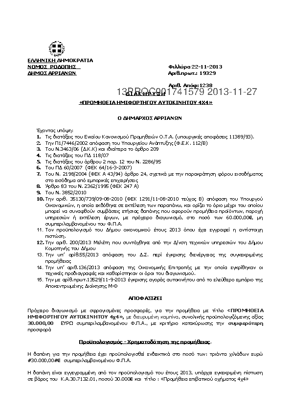 6. ΑΠΟΦΑΣΗ ΔΗΜΑΡΧΟΥ 1238/2013: ΔΙΑΚΗΡΥΞΗ ΔΙΑΓΩΝΙΣΜΟΥ "ΠΡΟΜΗΘΕΙΑ ΗΜΙΦΟΡΤΗΓΟΥ ΑΥΤΟΚΙΝΗΤΟΥ 4Χ4