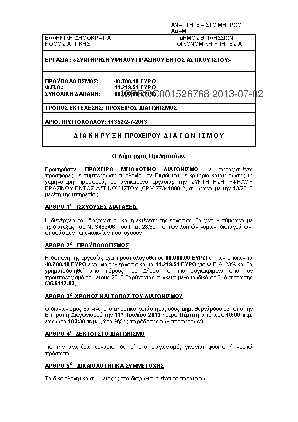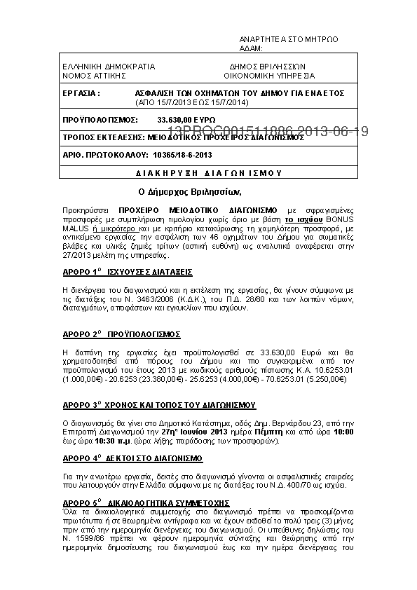 2. «ΑΣΦΑΛΙΣΗ ΤΩΝ ΟΧΗΜΑΤΩΝ ΤΟΥ ΔΗΜΟΥ ΓΙΑ ΕΝΑ ΕΤΟΣ (ΑΠΟ 15/7/2013 ΕΩΣ 15/7/2014)» ΔΙΑΚΗΡΥΞΗ ΔΙΑΓΩΝΙΣΜΟΥ