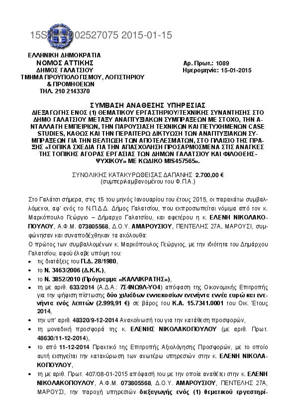 1. ΣΥΜΒΑΣΗ ΑΝΑΘΕΣΗΣ ΥΠΗΡΕΣΙΑΣ ΔΙΕΞΑΓΩΓΗΣ ΕΝΟΣ (1) ΘΕΜΑΤΙΚΟΥ ΕΡΓΑΣΤΗΡΙΟΥ/ΤΕΧΝΙΚΗΣ ΣΥΝΑΝΤΗΣΗΣ