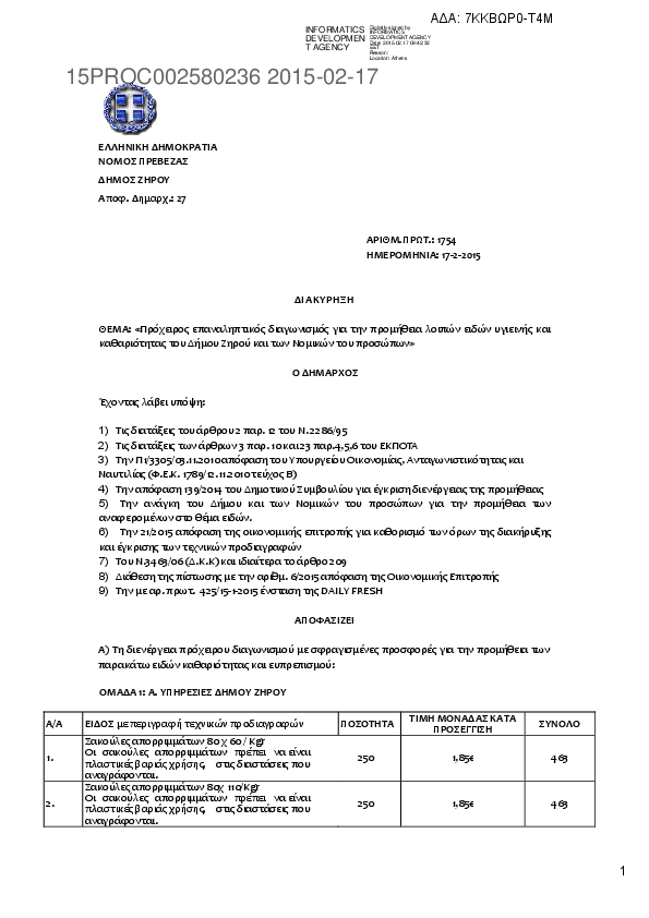 2. ΠΕΡΙΛΗΨΗ ΔΙΑΚΗΡΥΞΗΣ ΛΟΙΠΩΝ ΕΙΔΩΝ ΥΓΙΕΙΝΗΣ ΚΑΙ ΚΑΘΑΡΙΟΤΗΤΑΣ