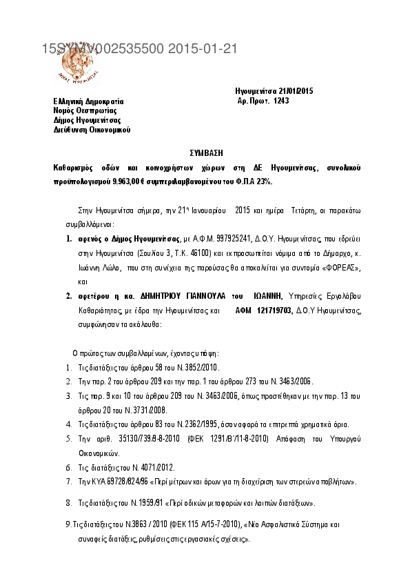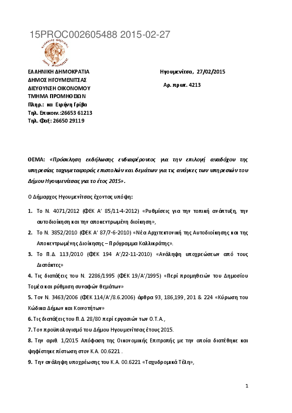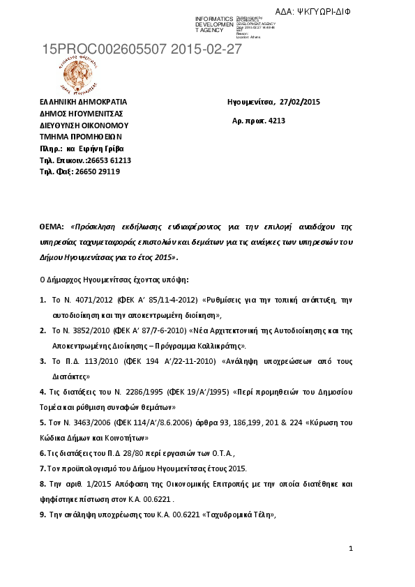 7. Επιλογή εταιρείας ταχυμεταφορών επιστολών και εγγράφων έτους 2015