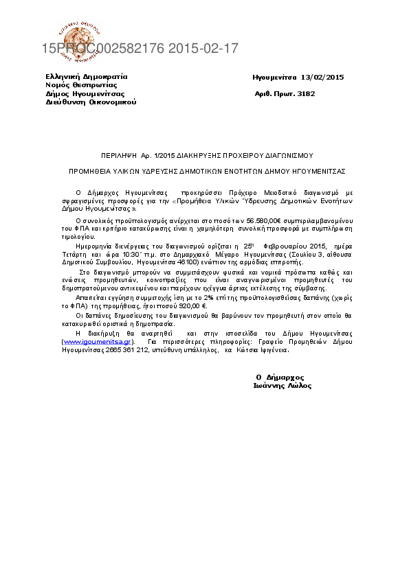 4. Προμήθεια υλικών ύδρευσης Δημοτικών Ενοτήτων Δήμου Ηγουμενίτσας