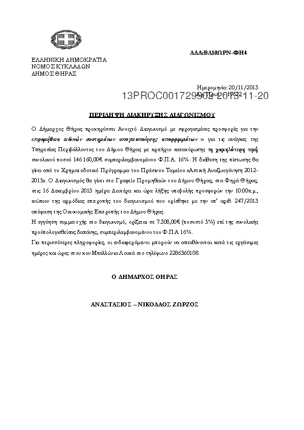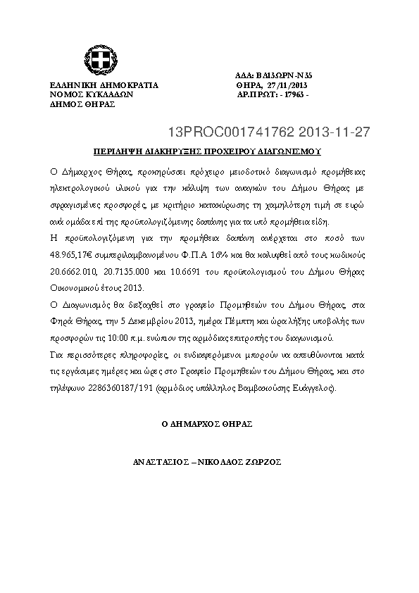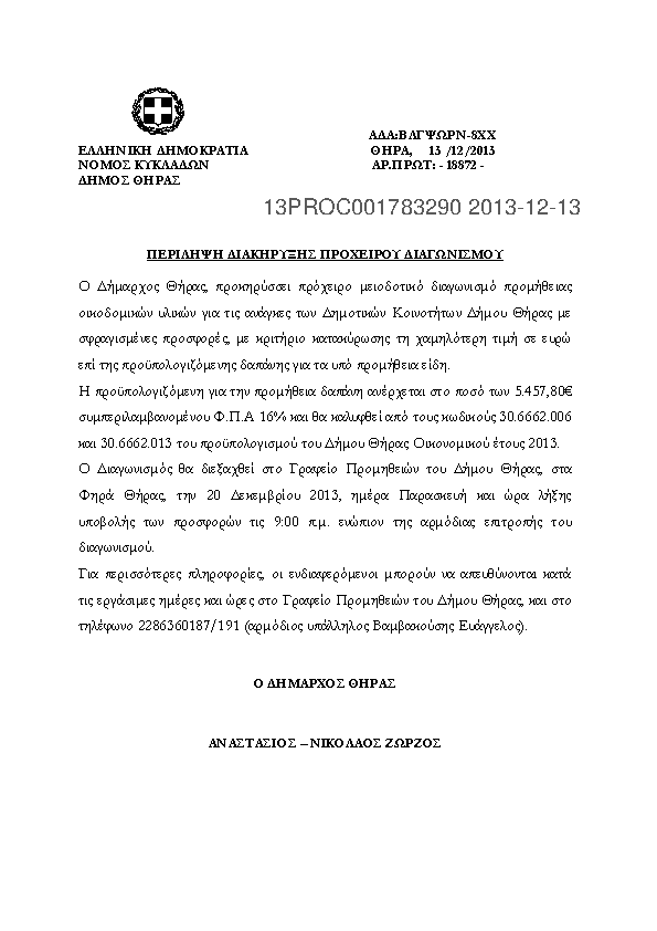 1. ΠΕΡΙΛΗΨΗ ΔΙΑΚΗΡΥΞΗΣ ΠΡΟΧΕΙΡΟΥ ΔΙΑΓΩΝΙΣΜΟΥ ΠΡΟΜΗΘΕΙΑΣ ΟΙΚΟΔΟΜΙΚΩΝ ΥΛΙΚΩΝ ΓΙΑ ΤΙΣ ΑΝΑΓΚΕΣ ΤΩΝ ΔΗΜΟΤΙΚΩΝ ΚΟΙΝΟΤΗΤΩΝ ΔΗΜΟΥ ΘΗΡΑΣ