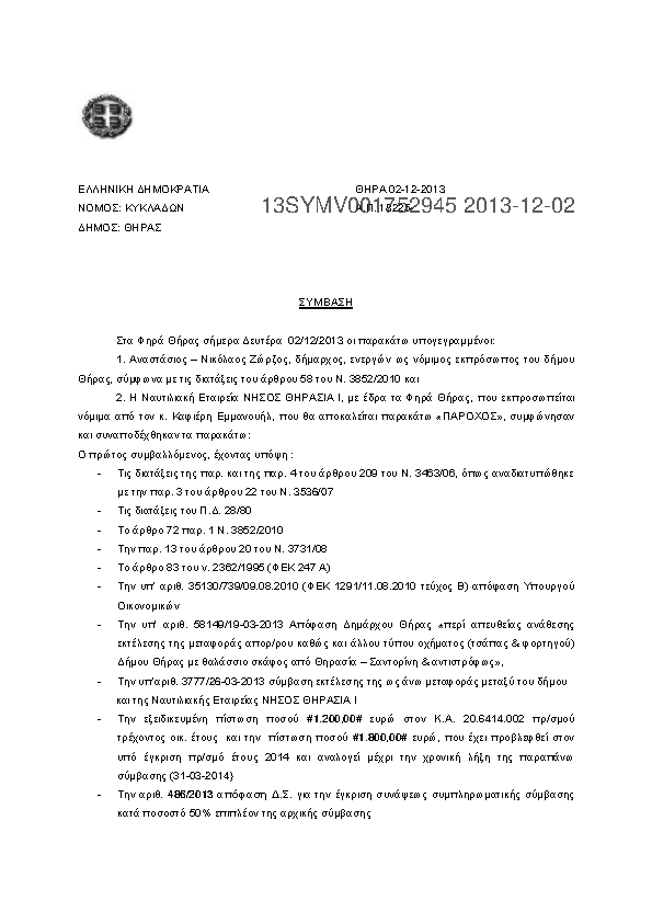 2. ΣΥΜΠΛΗΡΩΜΑΤΙΚΗ ΣΥΜΒΑΣΗ ΑΠΕΥΘΕΙΑΣ ΑΝΑΘΕΣΗΣ ΥΠΗΡΕΣΙΑΣ ΓΙΑ ΤΗΝ ΕΚΤΕΛΕΣΗ ΜΕΤΑΦΟΡΑΣ ΑΠΟΡ.ΡΟΥ ΑΠΟ ΘΗΡΑΣΙΑ