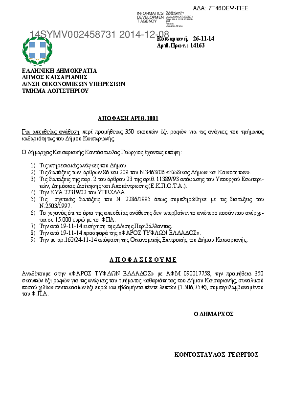 2. ΑΠΕΥΘΕΙΑΣ ΑΝΑΘΕΣΗ ΠΕΡΙ ΠΡΟΜΗΘΕΙΑΣ ΣΚΟΥΠΩΝ ΓΙΑ ΤΙΣ ΑΝΑΓΚΕΣ ΤΗΣ ΚΑΘ/ΤΑΣ ΤΟΥ ΔΗΜΟΥ ΚΑΙΣΑΡΙΑΝΗΣ