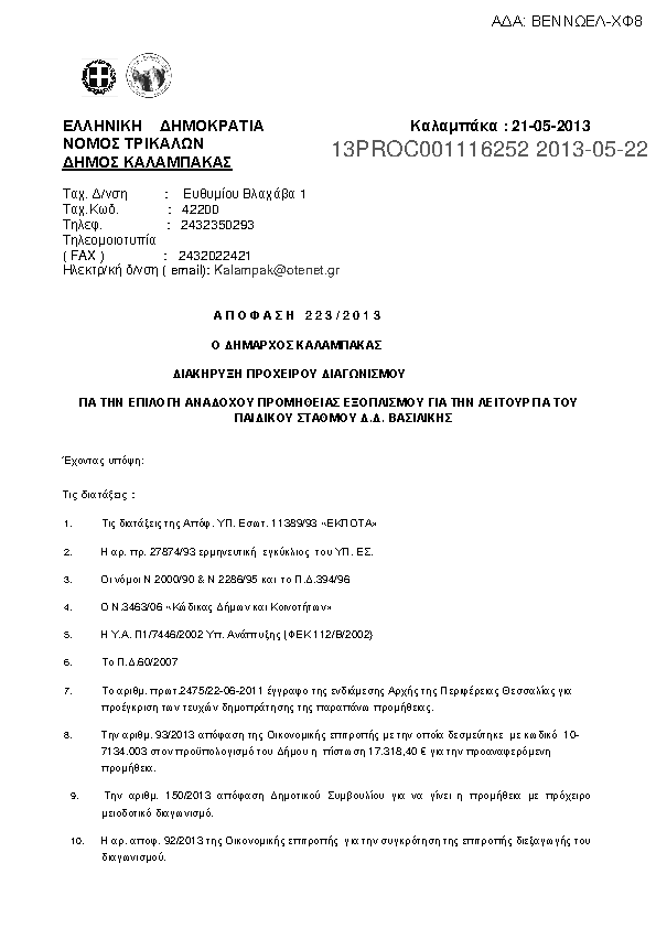 1. ΠΡΟΜΗΘΕΙΑ ΕΞΟΠΛΙΣΜΟΥ ΓΙΑ ΤΗ ΛΕΙΤΟΥΡΓΙΑ ΤΟΥ ΠΑΙΔΙΚΟΥ ΣΤΑΘΜΟΥ Δ.Δ. ΒΑΣΙΛΙΚΗΣ