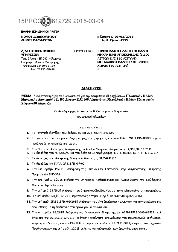 8. ΑΚΥΡΩΜΕΝΗ - Διενέργεια πρόχειρου διαγωνισμού για την προμήθεια «Τροχήλατων Πλαστικών Κάδων Μηχανικής Αποκομιδής