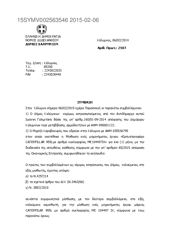 2. Μίσθωση ενός ερπυστριοφόρου μάρκα CATERPILLAR 955L με αριθμό κυκλοφορίας ΜΕ 104497ΙΧ