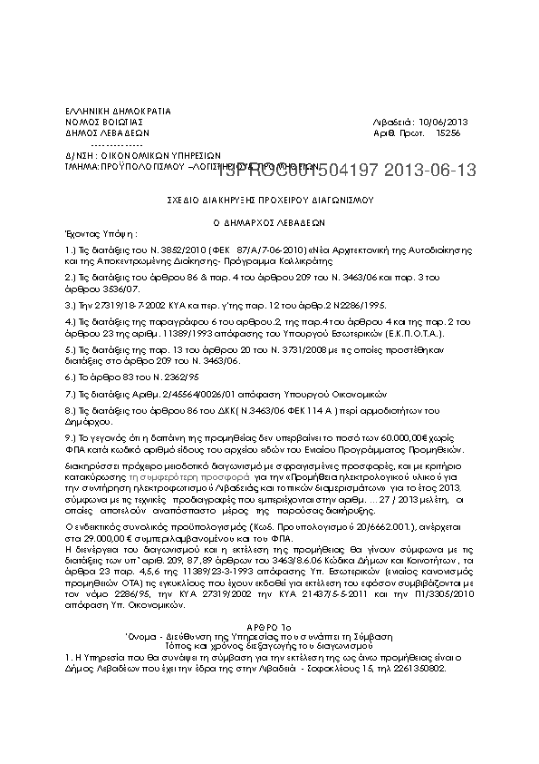 2. Έγκριση τεχνικών προδιαγραφών και καθορισμός όρων διακήρυξης για την «Προμήθεια ηλεκτρολογικού υλικού για τη συντήρηση ηλεκτροφωτισμού Λιβαδειάς και τοπικών διαμερισμάτων για το έτος 2013