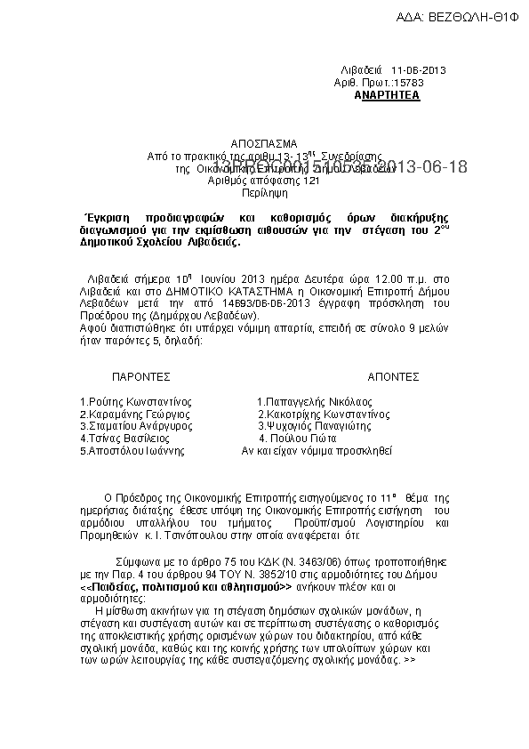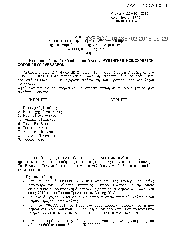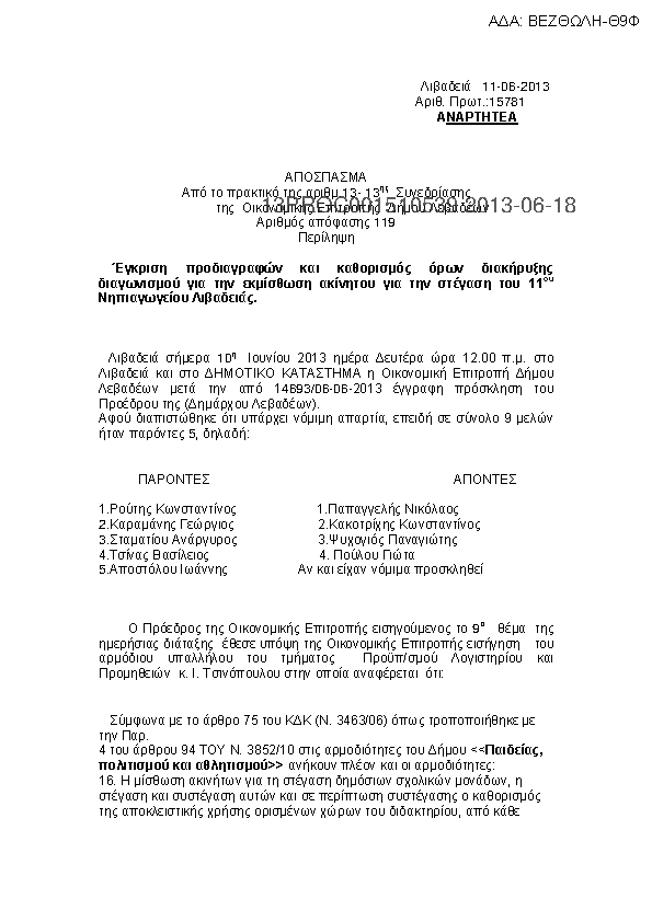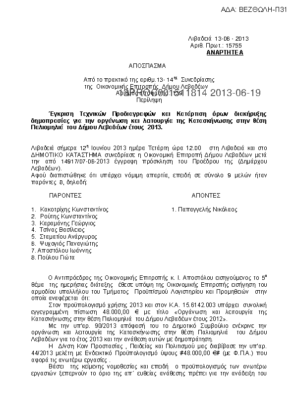 1. Έγκριση Τεχνικών Προδιαγραφών και Κατάρτιση όρων διακήρυξης δημοπρασίας για την οργάνωση και λειτουργία της Κατασκήνωσης στην θέση Παλιομηλιά του Δήμου Λεβαδέων έτους 2013