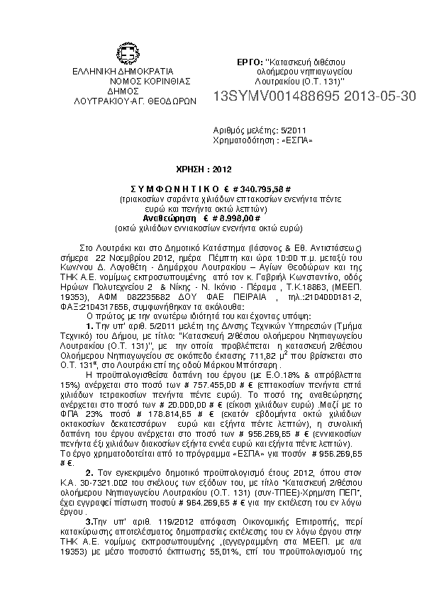 9. ΚΑΤΑΣΚΕΥΗ ΔΙΘΕΣΙΟΥ ΟΛΟΗΜΕΡΟΥ ΝΗΠΙΑΓΩΓΕΙΟΥ ΛΟΥΤΡΑΚΙΟΥ (Ο.Τ. 131)