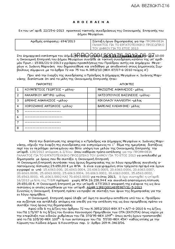 2. Σύνταξη όρων δημοπρασίας για την ΠΡΟΜΗΘΕΙΑ ΓΑΛΑΚΤΟΣ ΓΙΑ ΤΟ ΕΡΓΑΤΟΤΕΧΝΙΚΟ ΠΡΟΣΩΠΙΚΟ ΤΟΥ ΔΗΜΟΥ ΓΙΑ ΤΟ ΕΤΟΣ 2013