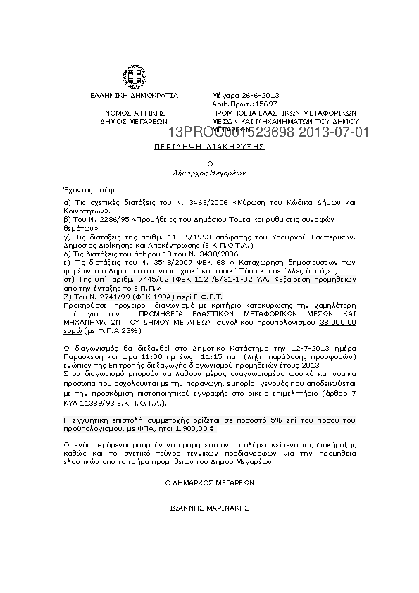 1. ΠΕΡΙΛΗΨΗ ΔΙΑΚΗΡΥΞΗΣ ΓΙΑ ΤΗΝ ΠΡΟΜΗΘΕΙΑ ΕΛΑΣΤΙΚΩΝ ΜΕΤΑΦΟΡΙΚΩΝ ΜΕΣΩΝ ΚΑΙ ΜΗΧΑΝΗΜΑΤΩΝ ΤΟΥ ΔΗΜΟΥ ΜΕΓΑΡΕΩΝ