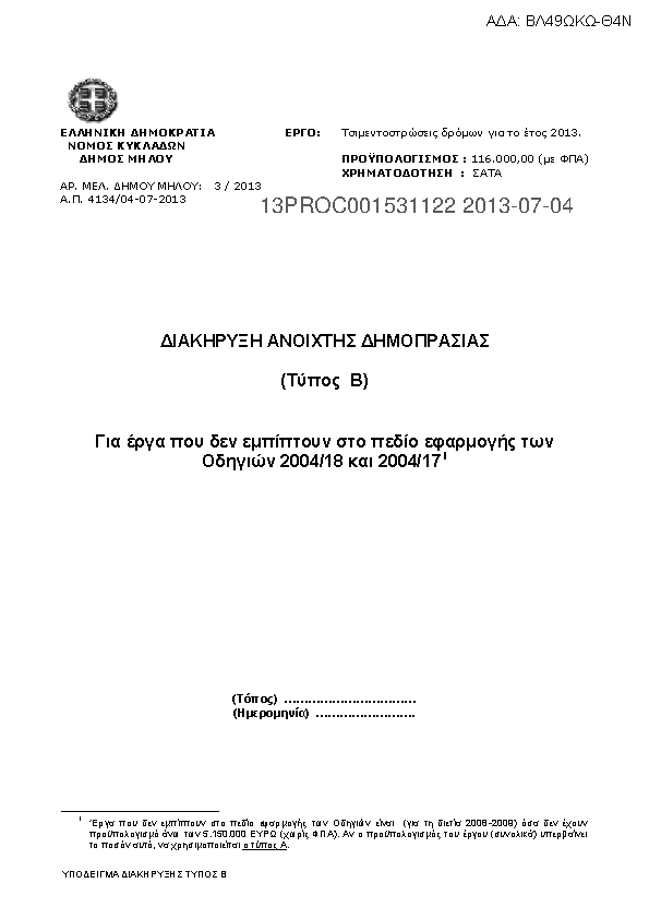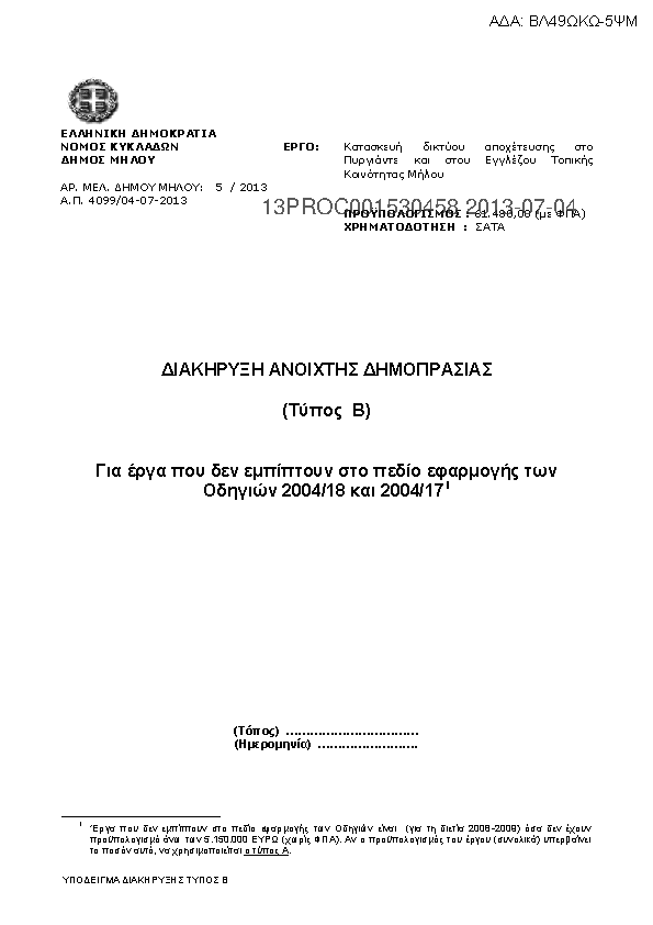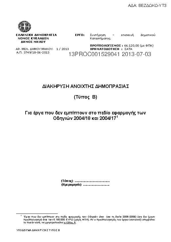 2. ΔΙΑΚΗΡΥΞΗ ΑΝΟΙΚΤΗΣ ΔΗΜΟΠΡΑΣΙΑΣ του έργου: Ανακατασκευή γηπέδου μπάσκετ στα πλαίσια της Συντήρησης Εθνικού Σταδίου Μήλου