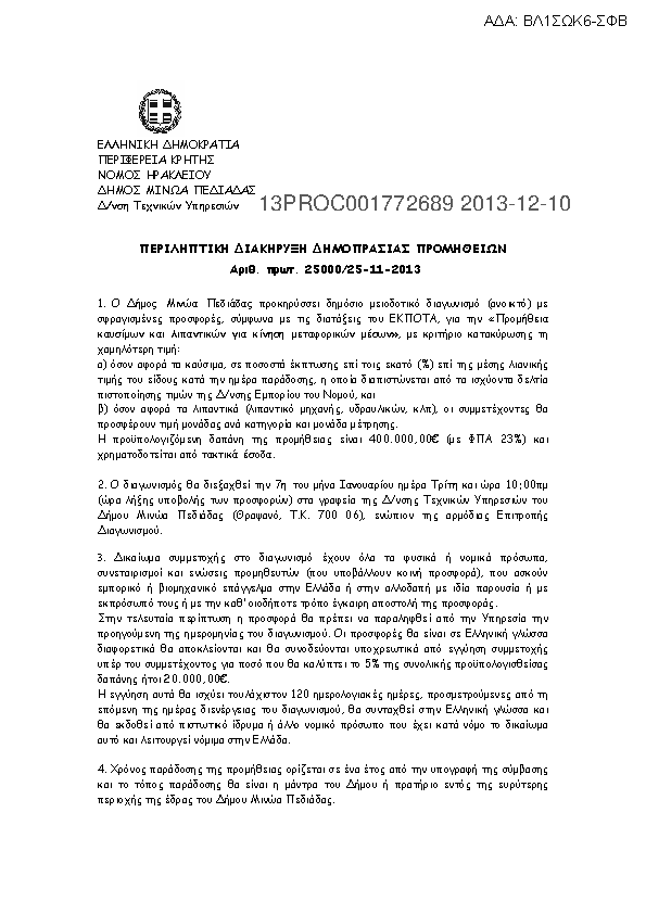 9. Περιληπτική διακήρυξη δημοπρασίας "Προμήθειας καυσίμων και λιπαντικών για κίνηση μεταφορικών μέσων"