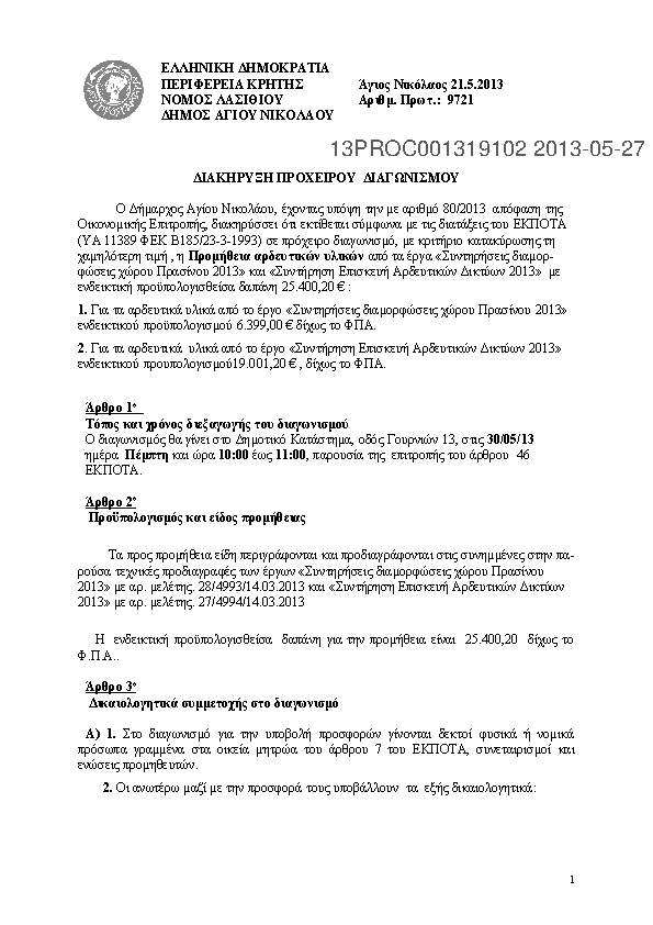1. ΠΡΟΧΕΙΡΟΣ ΔΙΑΓΩΝΙΣΜΟΣ ΓΙΑ ΠΡΟΜΗΘΕΙΑ ΑΡΔΕΥΤΙΚΩΝ ΥΛΙΚΩΝ 2013