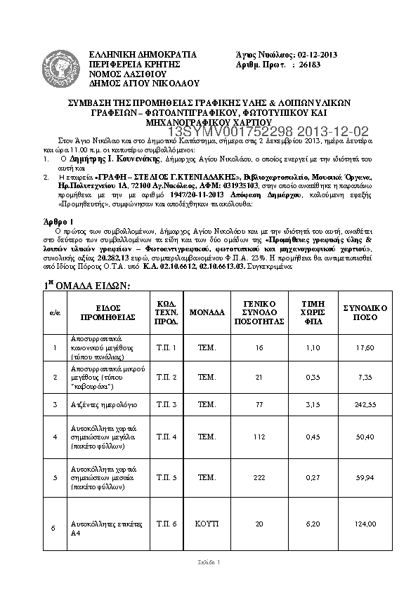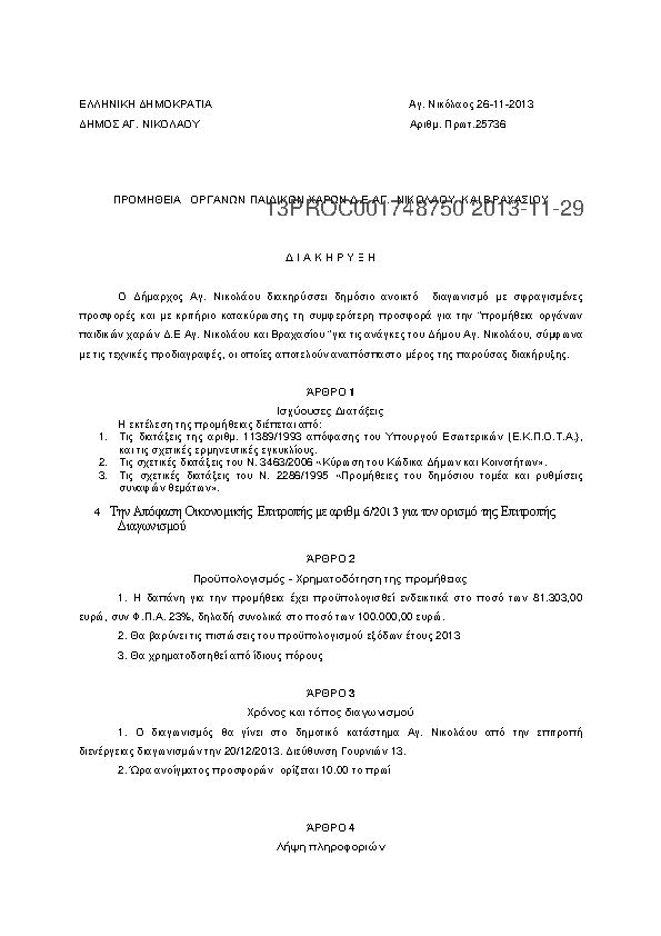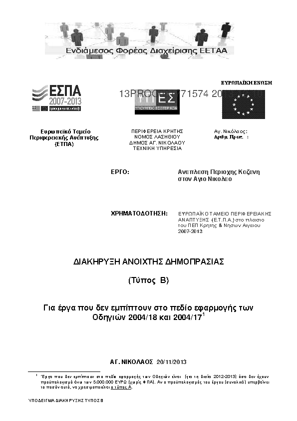 1. Διακήρυξη για την ανάδειξη αναδόχου του έργου ΄΄Ανάπλαση Περιοχής Καζάνη στον Άγιο Νικόλαο΄΄