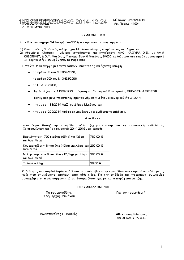 4. Συμφωνητικό προμήθειας ειδών ζαχ/ικής για τις εκδηλώσεις των Χριστουγέννων και της Πρωτοχρονιάς