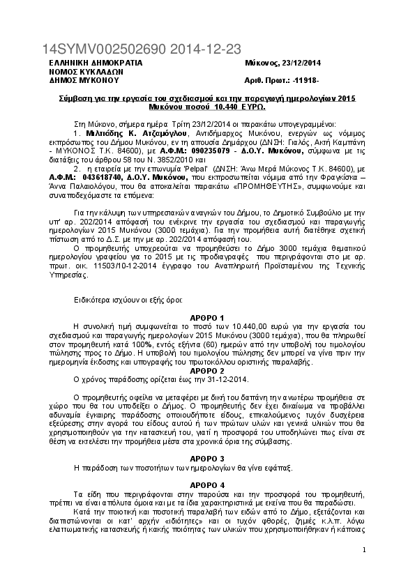 2. Σύμβαση για την εργασία του σχεδιασμού και την παραγωγή ημερολογίων 2015 Μυκόνου ποσού 10.440 ΕΥΡΩ