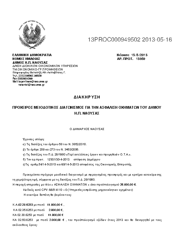 1. ΠΡΟΧΕΙΡΟΣ ΜΕΙΟΔΟΤΙΚΟΣ ΔΙΑΓΩΝΙΣΜΟΣ ΓΙΑ ΤΗΝ ΑΣΦΑΛΙΣΗ ΟΧΗΜΑΤΩΝ ΤΟΥ ΔΗΜΟΥ Η.Π. ΝΑΟΥΣΑΣ