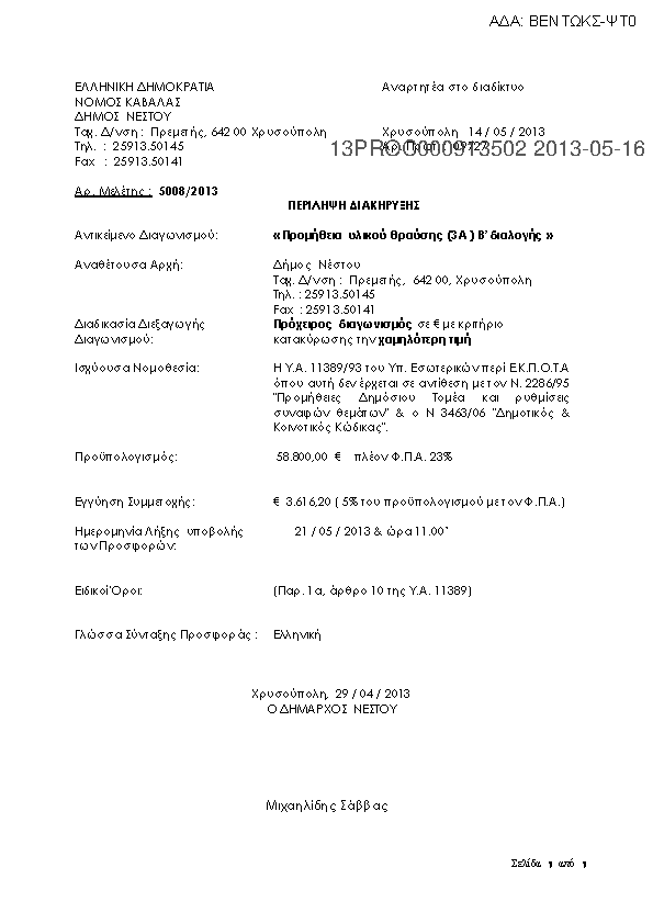 1. Περίληψη Διακήρυξης για την "Προμήθεια υλικού θραύσης (3Α) β' διαλογής"