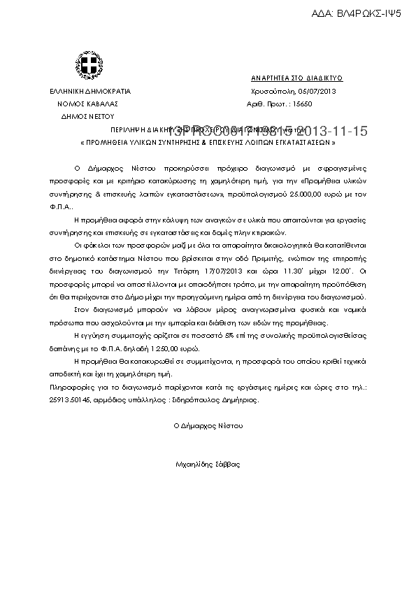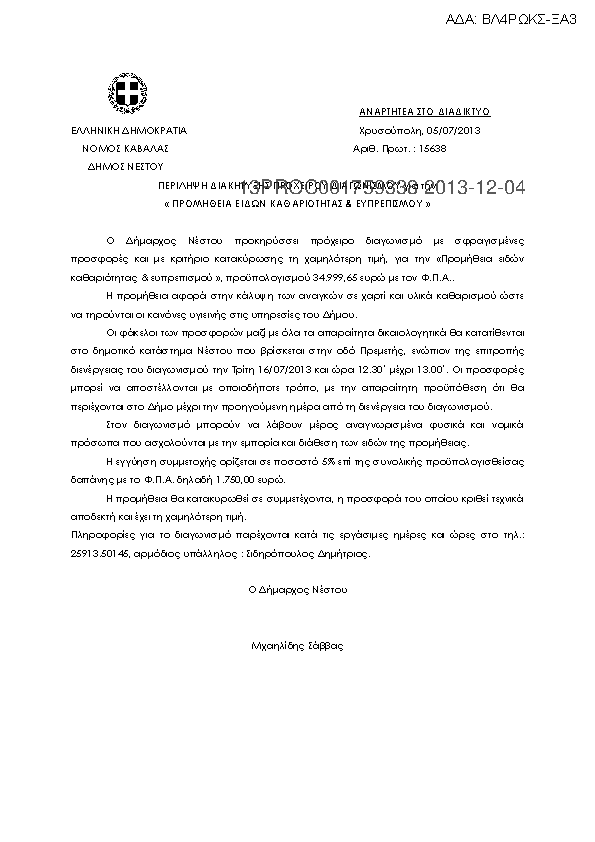 2. Περίληψη Διακήρυξης για την "Προμήθεια ειδών καθαριότητας & ευπρεπισμού"