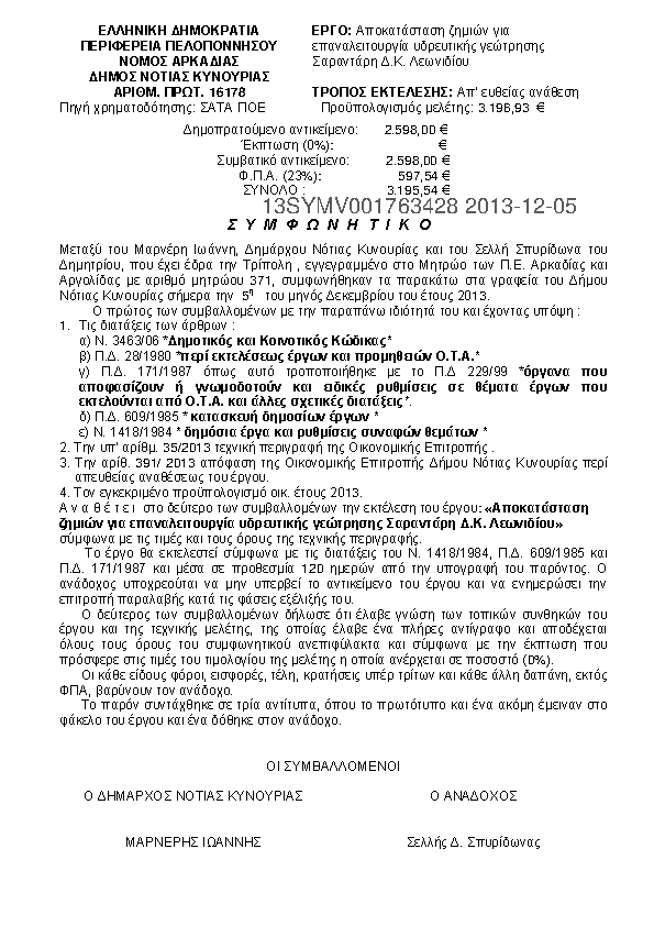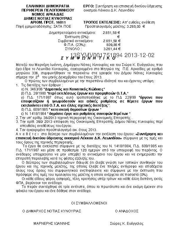 4. Σύμβαση συντήρησης και επισκευής δικτύου ύδρευσης οικισμού Λάκκου Δ.Κ. Λεωνιδίου