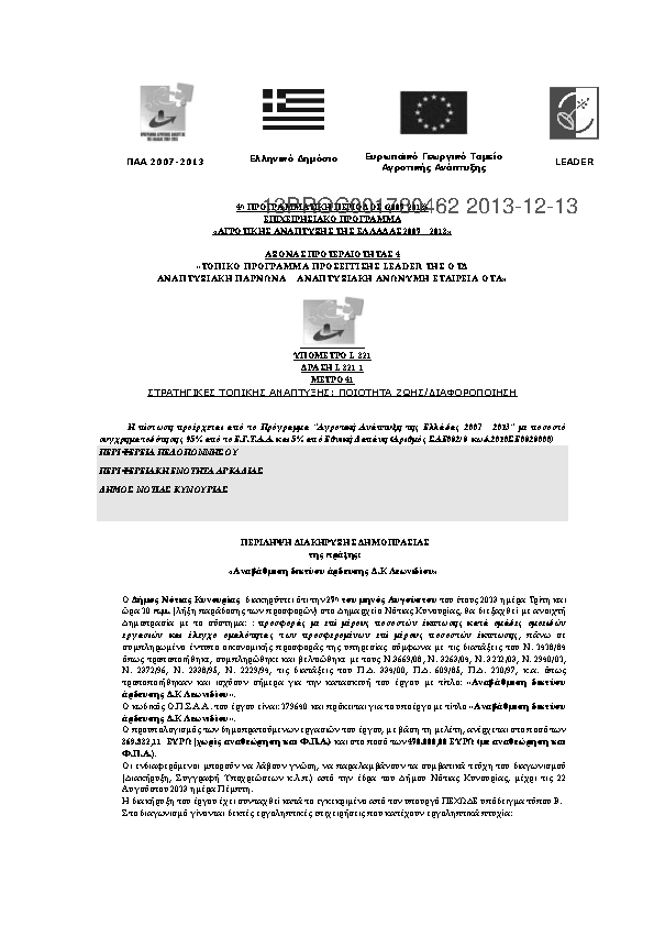 1. Περί της σύνταξης της διακήρυξης και της κατάρτισης των όρων της δημοπρασίας του έργου «Αναβάθμιση δικτύου άρδευσης Δ.Κ. Λεωνιδίου» προϋπολογισμού ποσού 490.000,00€ (η σχετική έγκριση διάθεσης πίστωσης έχει παρθεί με την 179/2013 απόφαση...