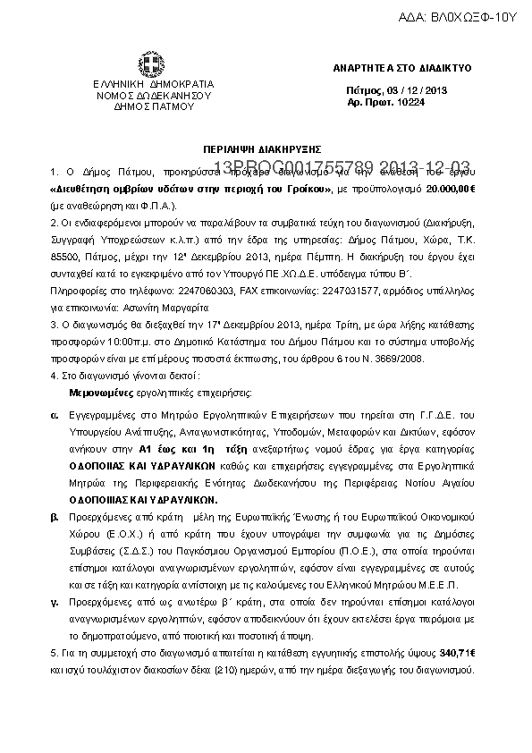 1. Περίληψη διακήρυξης του έργου:"Διευθέτηση ομβρίων υδάτων στην περιοχή του Γροίκου"