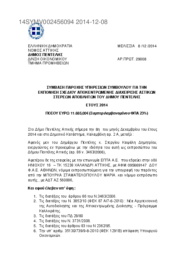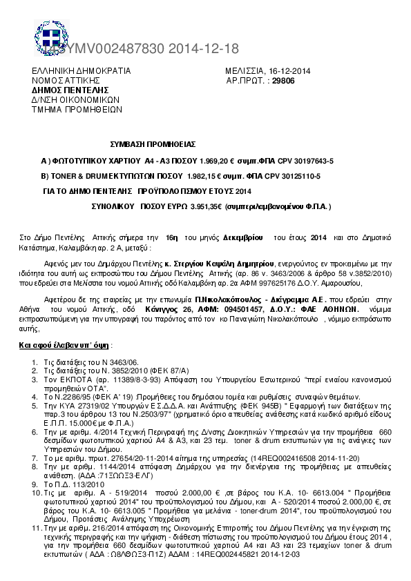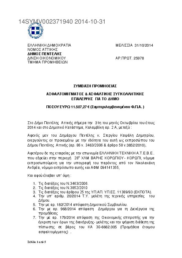 1. ΣΥΜΒΑΣΗ ΠΡΟΜΗΘΕΙΑΣ ΑΣΦΑΛΤΟΜΙΓΜΑΤΟΣ ΔΗΜΟΥ ΠΕΝΤΕΛΗΣ