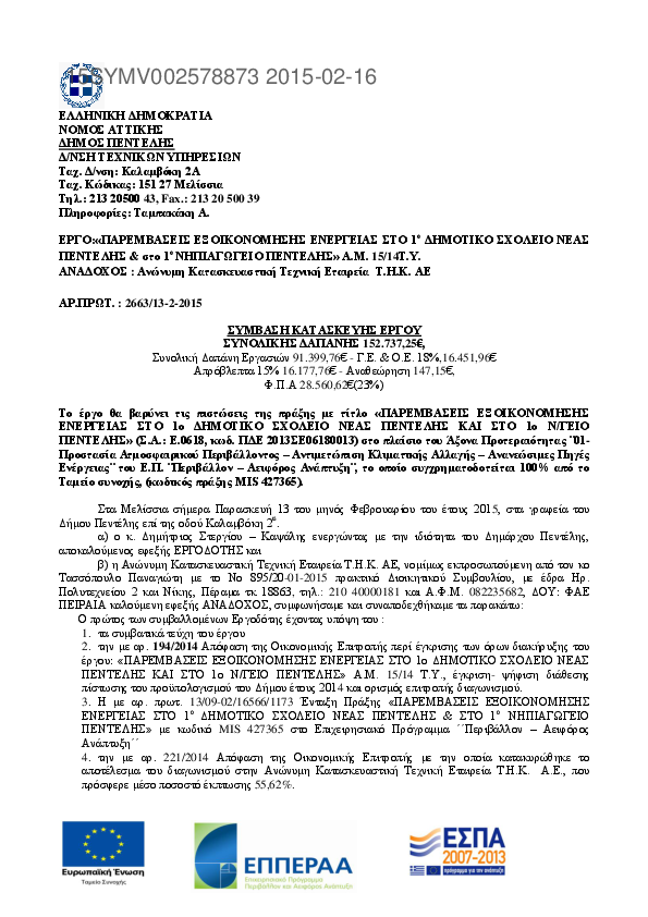 10. ΣΥΜΒΑΣΗ ΓΙΑ ΤΗΝ ΚΑΤΑΣΚΕΥΗ ΤΟΥ ΕΡΓΟΥ: ΠΑΡΕΜΒΑΣΕΙΣ ΕΞΟΙΚΟΝΟΜΗΣΗΣ ΕΝΕΡΓΕΙΑΣ ΣΤΟ 1ο ΔΗΜΟΤΙΚΟ ΣΧΟΛΕΙΟ Ν.